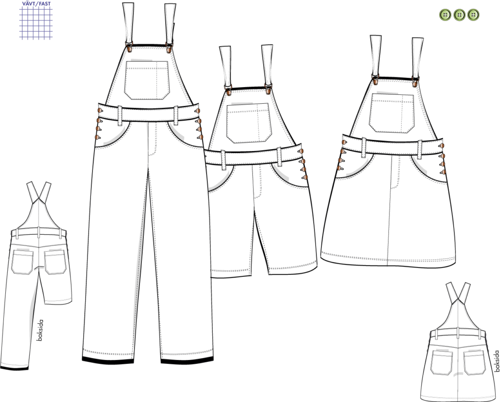 Ladda ner gratis symönster för hängselbyxor i PDF-format. Perfekta mönster i DIN A4 och rekommenderade tyger för enkel och kreativ sömnad hemma.